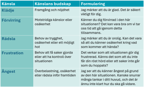 Känslor fungerar som ett fönster till människans behov, eftersom de visar hur saker och ting utvecklas i förhållande till den egna viljan. Alla har ett behov av att bli sedda, förstådda och uppskattade. Det är också viktigt att känna att man blir rättvist behandlad och att man har en känsla av kontroll över sitt eget liv. Upplevelsen av att göra framsteg och känna mening är också centrala behov som påverkar välbefinnande och motivation.